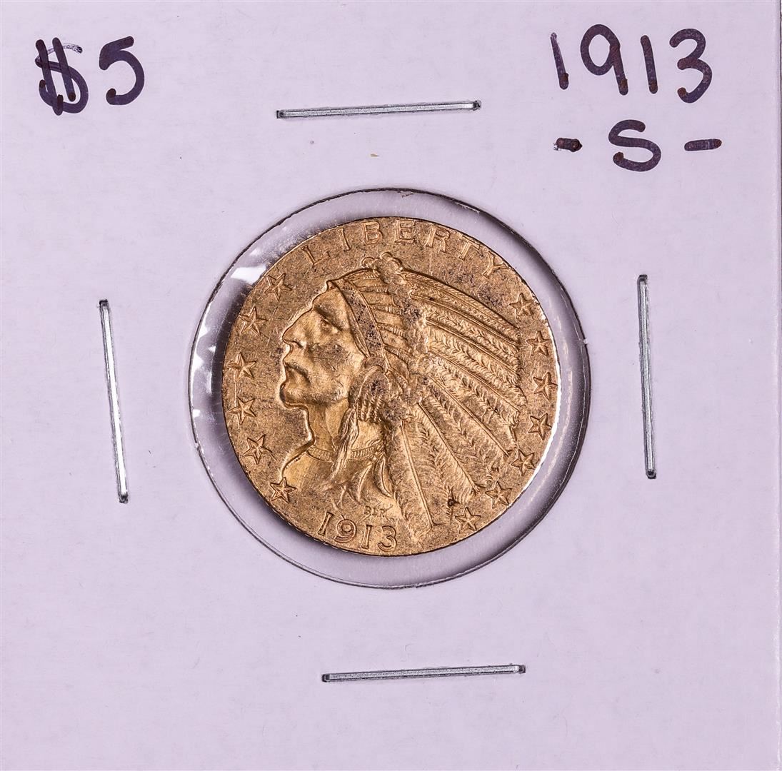 One 1913-S $5 Indian Head Half Eagle Gold Coin.