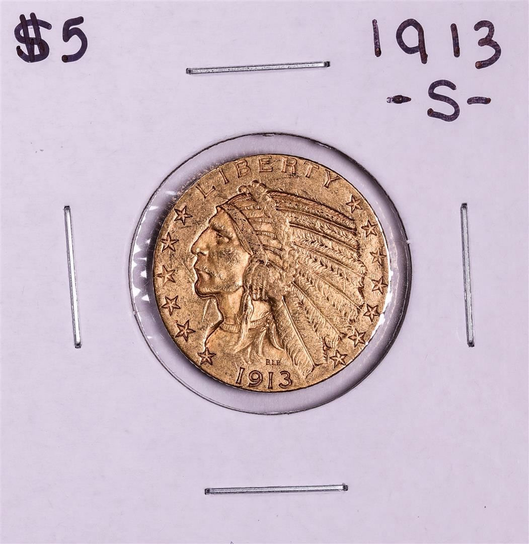 One 1913-S $5 Indian Head Half Eagle Gold Coin.