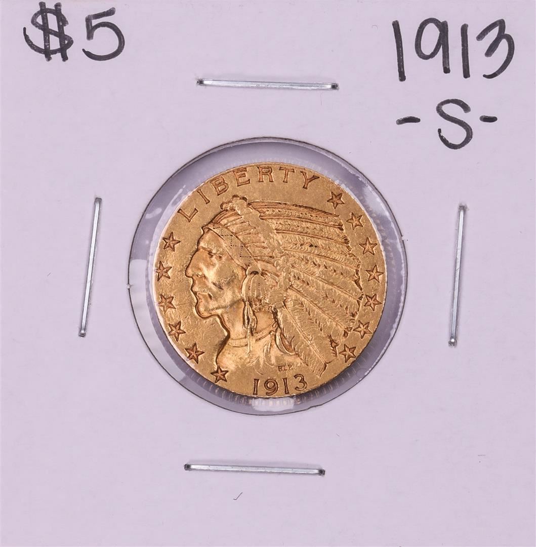 One 1913-S $5 Indian Head Half Eagle Gold Coin.