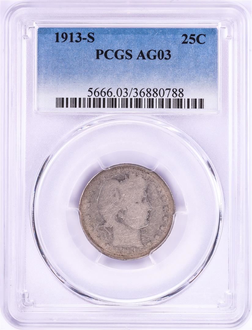 One 1913-S Barber Quarter Coin PCGS AG03. PCGS Graded.