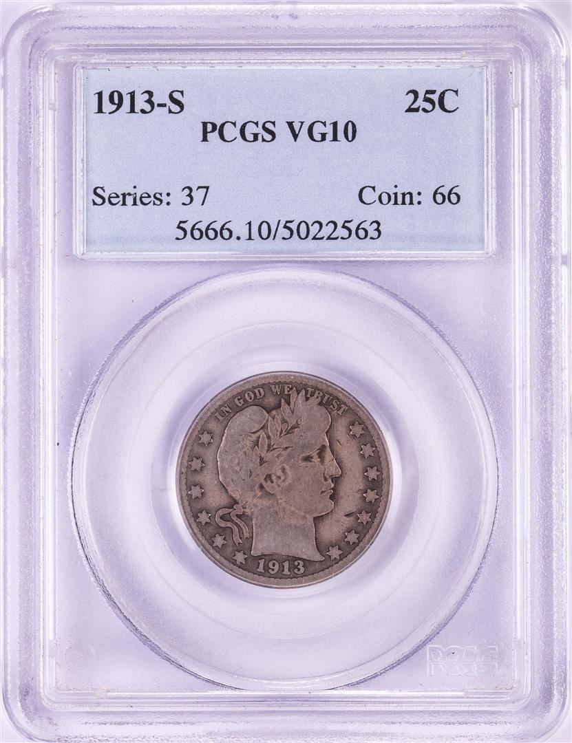 One 1913-S Barber Quarter Coin PCGS VG10. PCGS Graded.