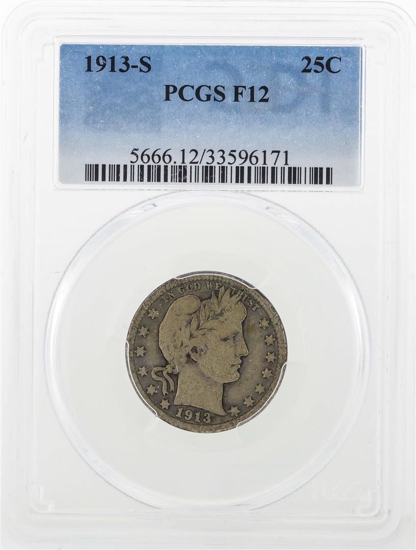 One 1913-S Barber Quarter Dollar Coin PCGS F12. PCGS Graded.