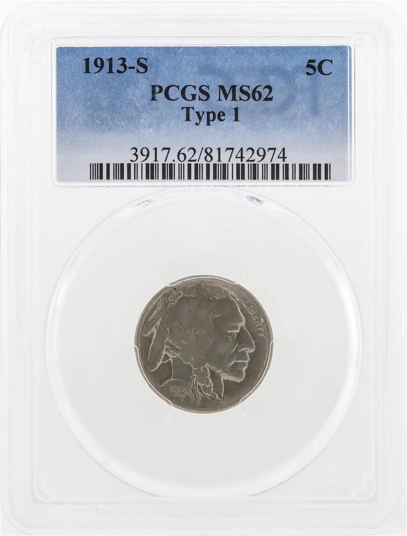 One 1913-S Buffalo Nickel Coin PCGS MS62 Type 1. PCGS Graded.