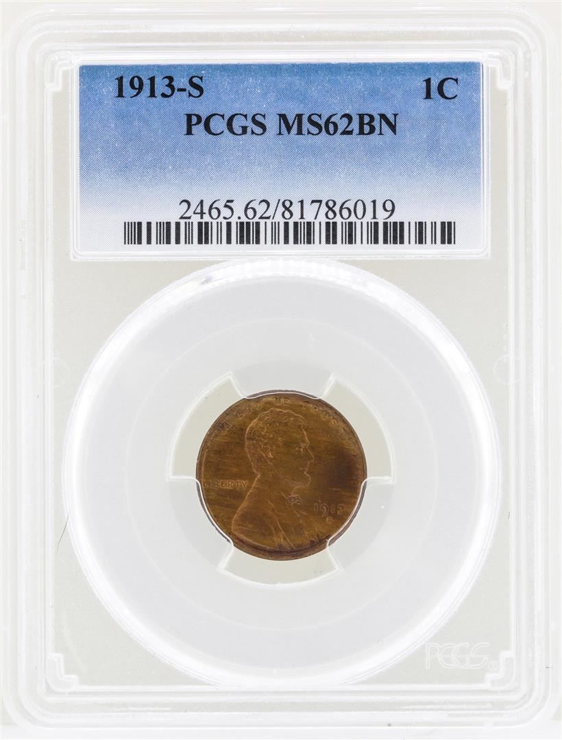 One 1913-S Lincoln Wheat Penny Coin PCGS MS62BN. PCGS Graded.