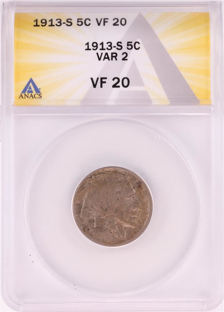 One 1913-S Type 2 Buffalo Nickel Coin ANACS VF20. ANACS Certified.