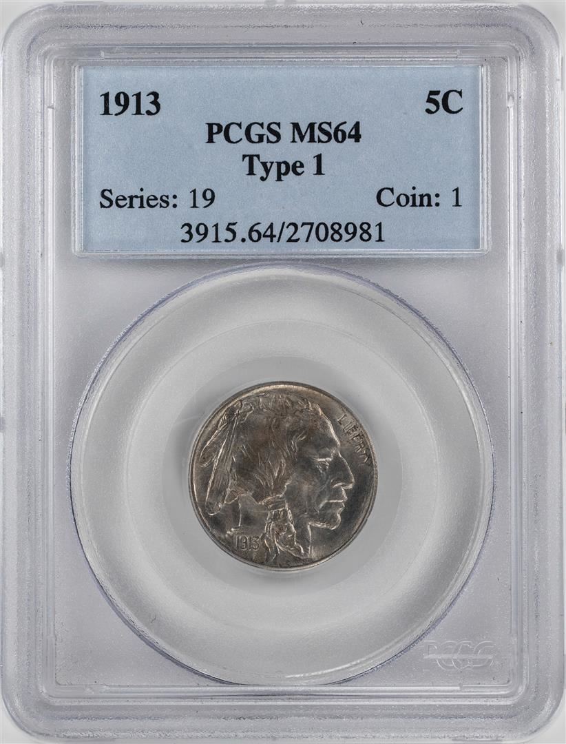 One 1913 Type 1 Buffalo Nickel Coin PCGS MS64. PCGS Graded.