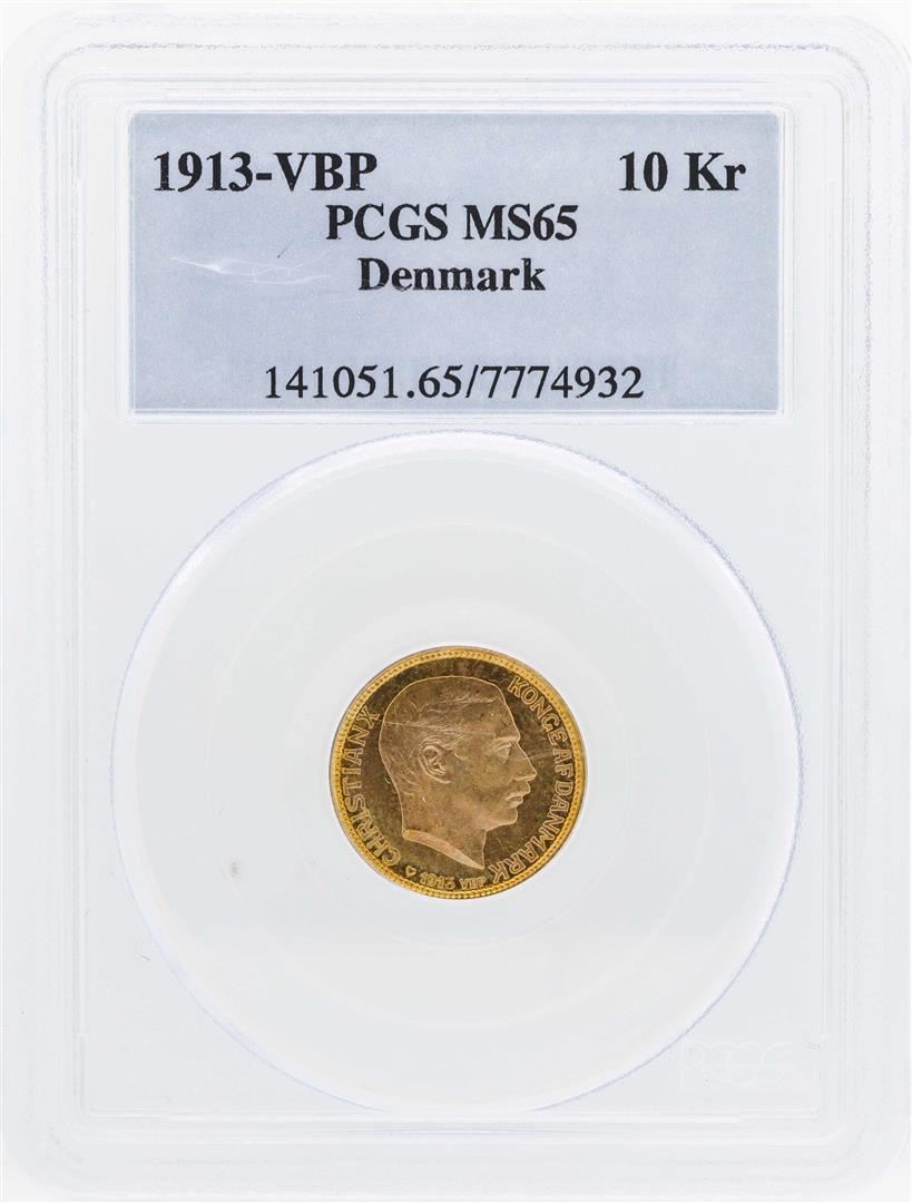 One 1913 VBP Denmark 10 Kroners Gold Coin PCGS MS65. PCGS Graded.