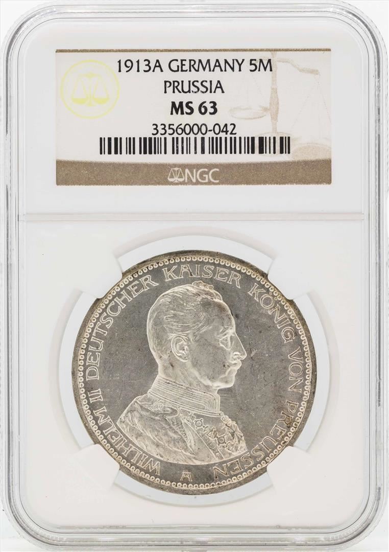 One 1913A Germany 5 Marks Silver Coin NGC MS63. NGC Certified.