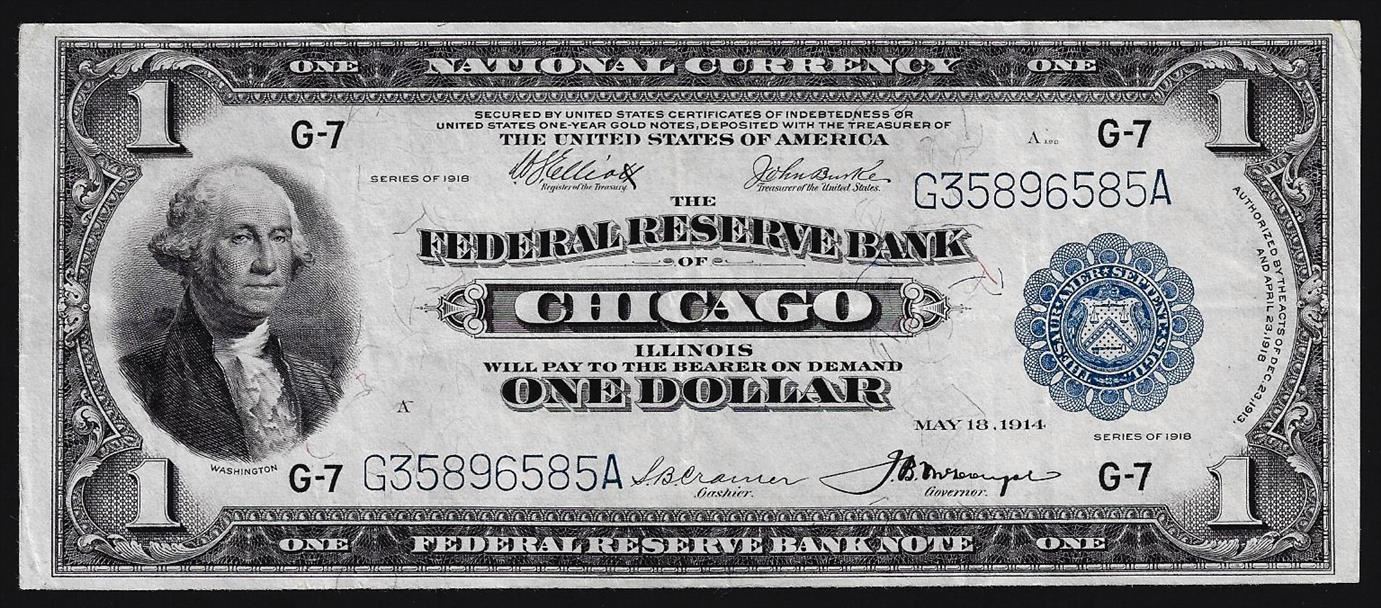 One 1914 $1 The Federal Reserve Bank of Chicago National Currency Note.