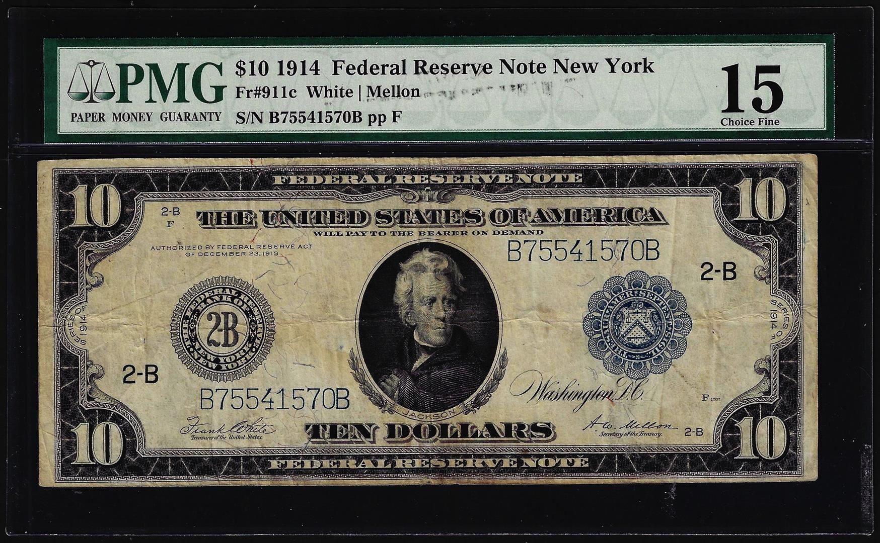 One 1914 $10 Federal Reserve Note New York Fr.911c PMG Choice Fine 15. PMG Certified.