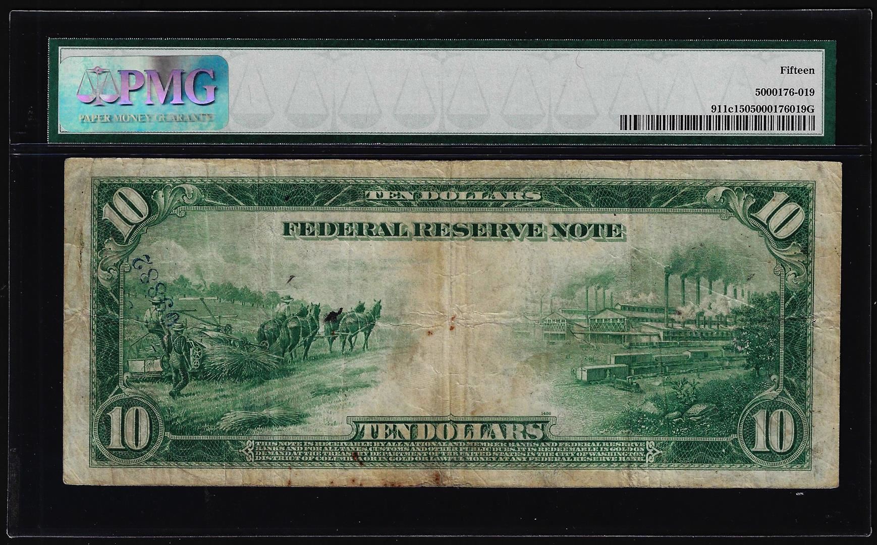 1914 $10 Federal Reserve Note New York Fr.911c PMG Choice Fine 15