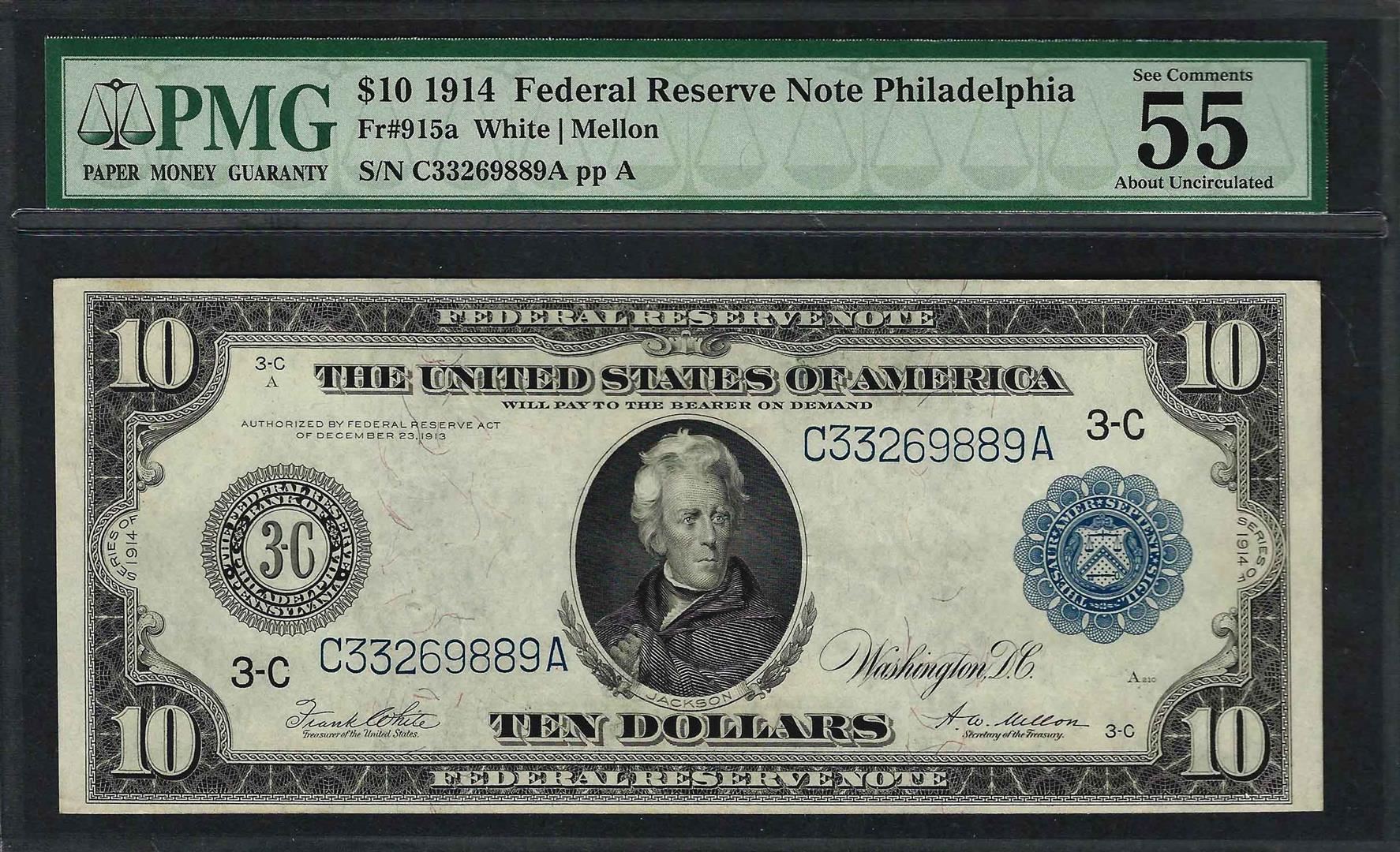 1914 $10 Federal Reserve Note Philadelphia Fr.915a PMG About Uncirculated 55EPQ