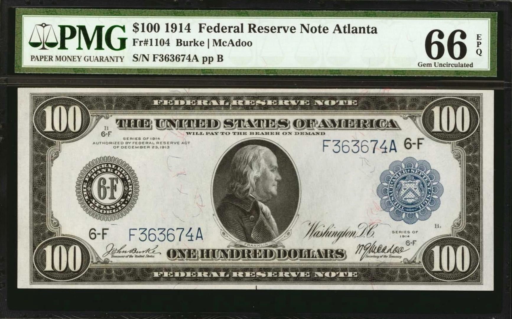 1914 $100 Federal Reserve Note Atlanta Fr.1104 PMG Gem Uncirculated 66EPQ