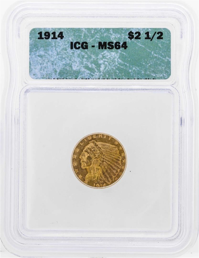 One 1914 $2 1/2 Indian Head Quarter Eagle Gold Coin ICG MS64. ICG Certified.