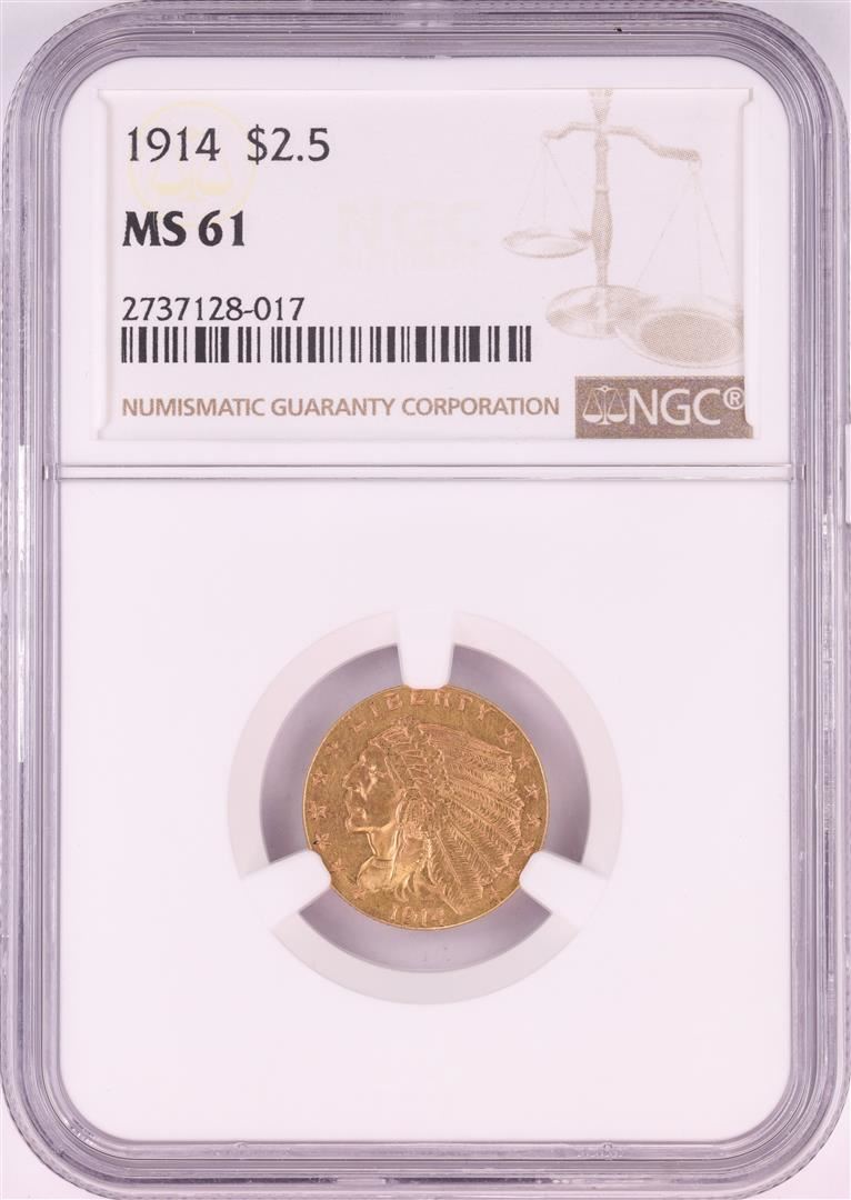 One 1914 $2 1/2 Indian Head Quarter Eagle Gold Coin NGC MS61. NGC Certified.
