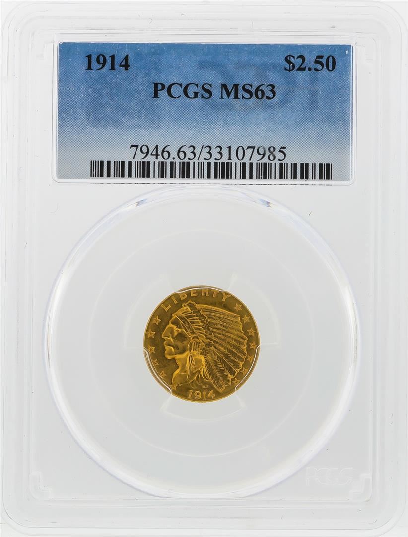 One 1914 $2 1/2 Indian Head Quarter Eagle Gold Coin PCGS MS63. PCGS Graded.