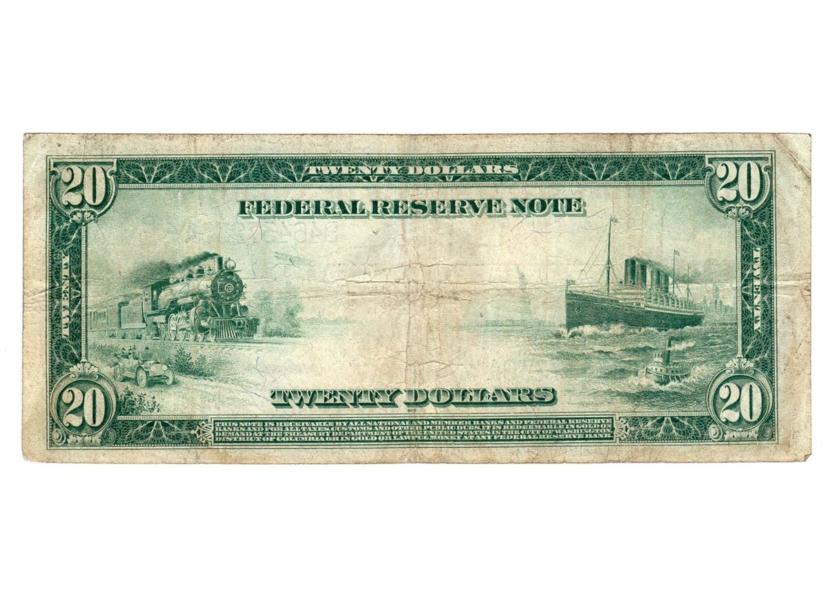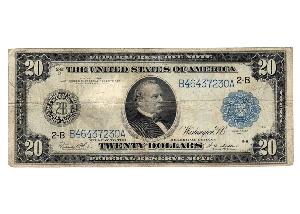 One 1914 $20 Blue Seal Large Federal Reserve Bank Note.