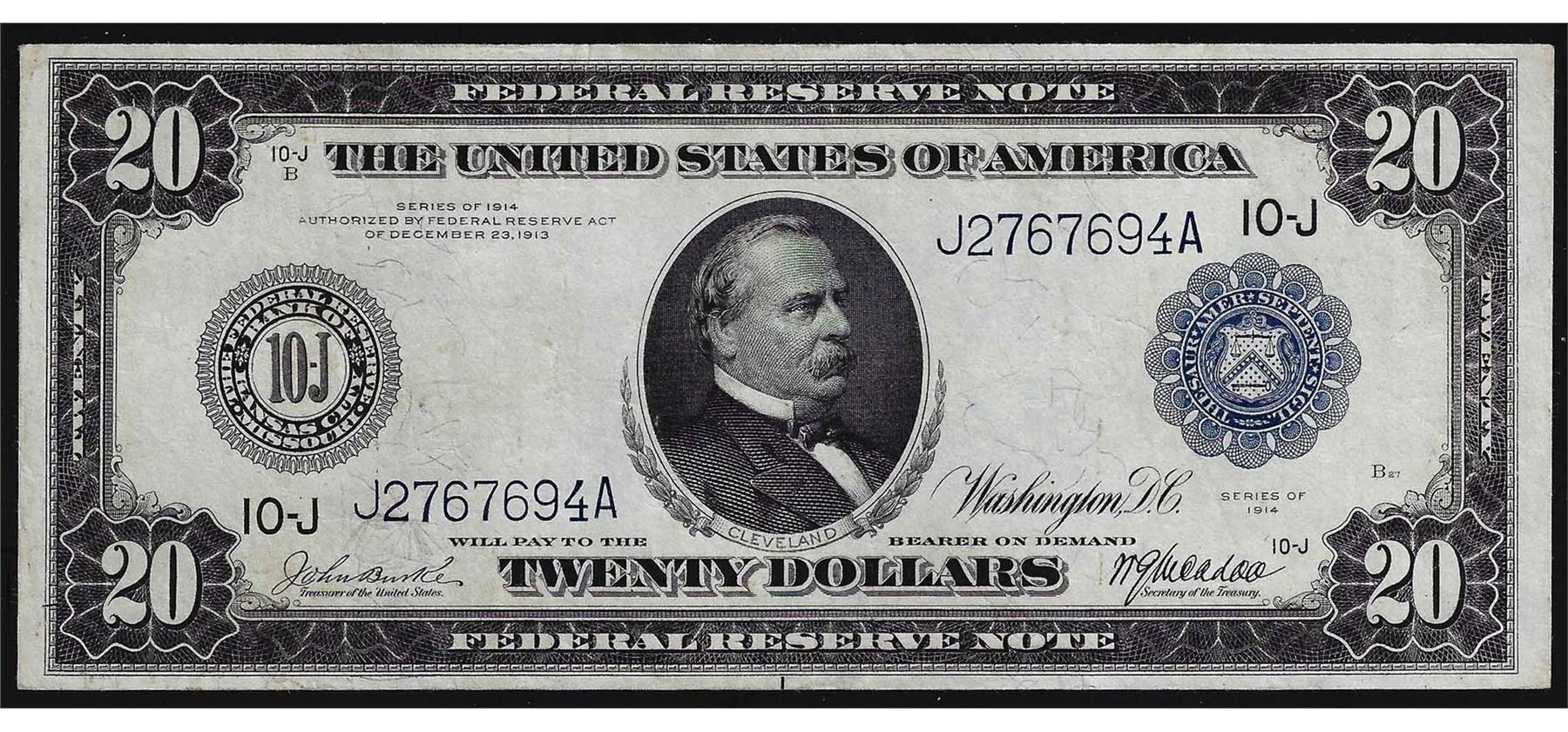 One 1914 $20 Federal Reserve Note Blue Seal.