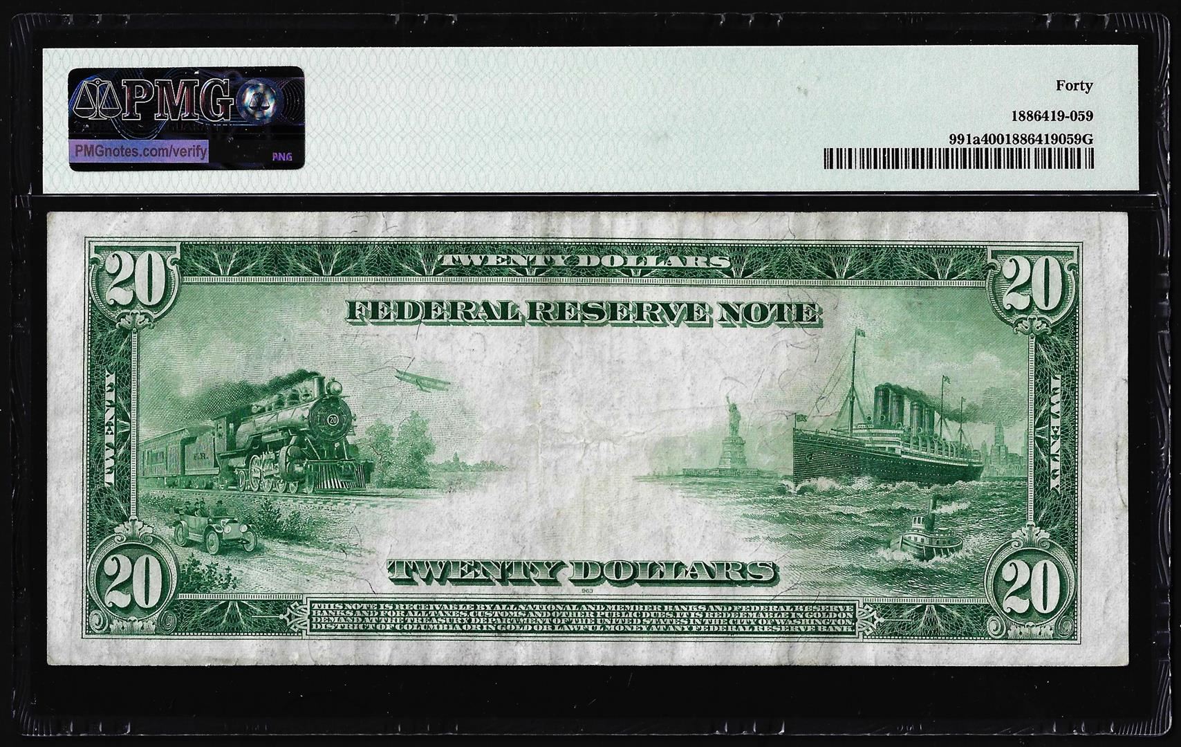 One 1914 $20 Federal Reserve Note Chicago Fr.991a PMG Extremely Fine 40. PMG Certified.