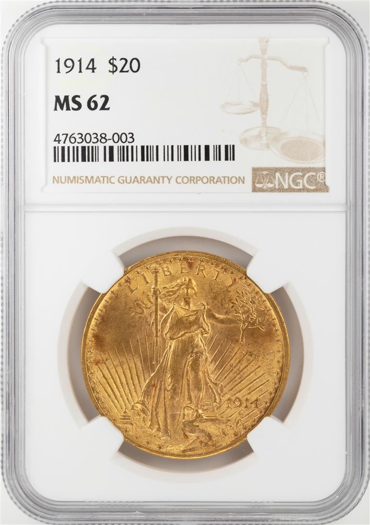 One 1914 $20 St. Gaudens Double Eagle Gold Coin NGC MS62. NGC Certified.