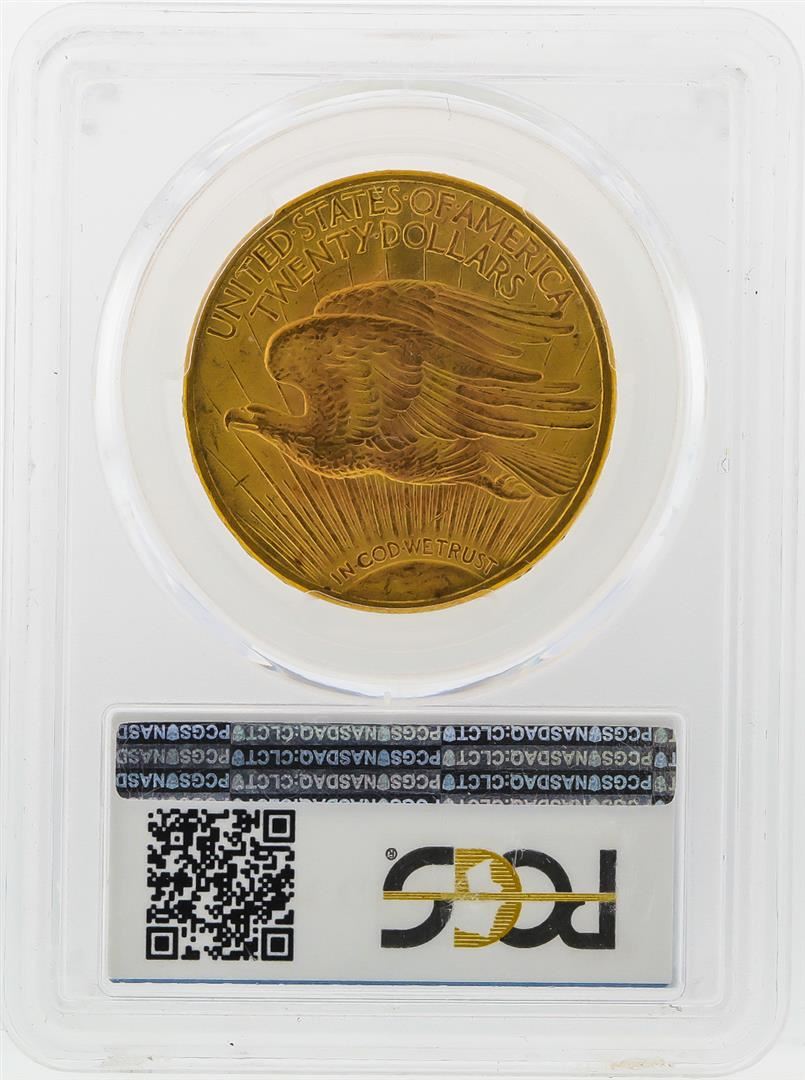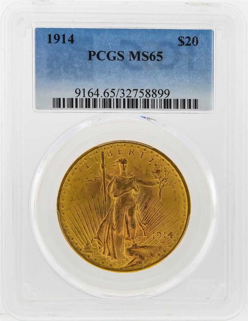 1914 $20 St. Gaudens Double Eagle Gold Coin PCGS Graded MS65. This impressive Gem offers well-detailed design elements and pleasing orange-gold surfaces with no mentionable distractions. Vibrant mint luster adds to the outstanding eye appeal. Population: 40 in 65, 3 finer in either PGC or PCGS graded coins as of 6/29/2016. PCGS Graded.