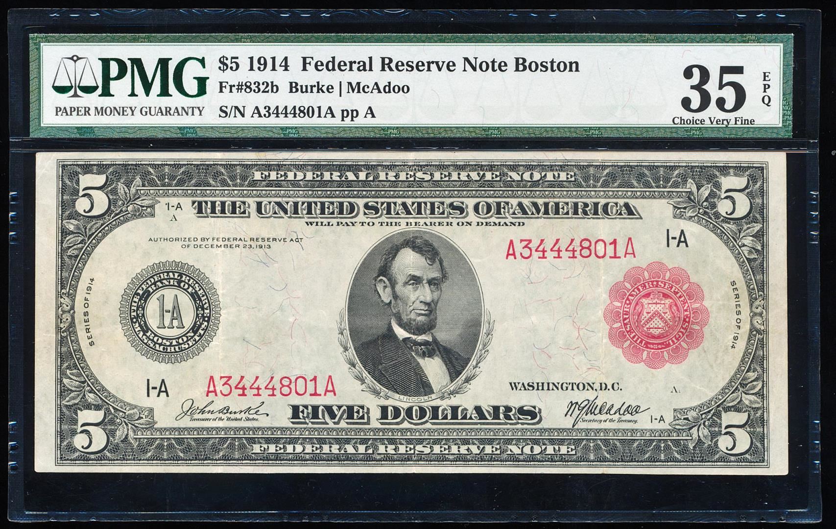 One 1914 $5 Federal Reserve Note Boston Fr.832b PMG Choice Very Fine 35EPQ. PMG Certified.