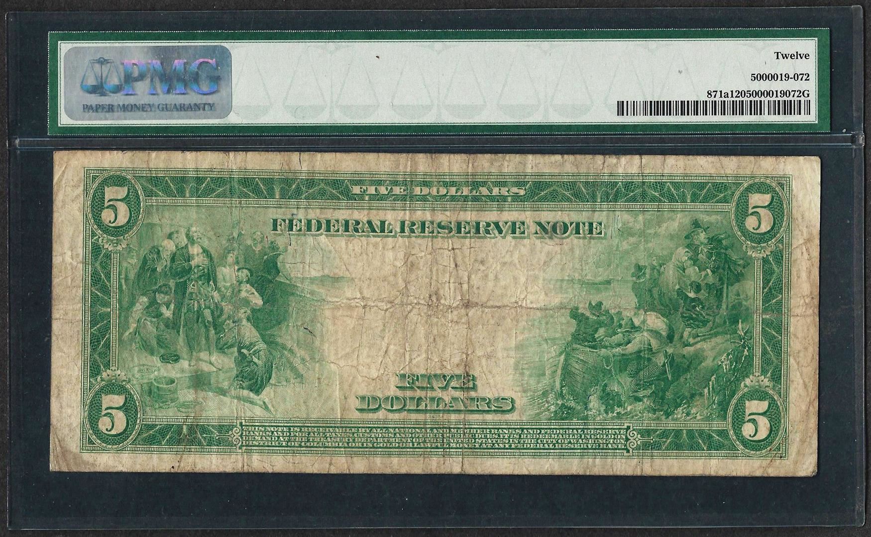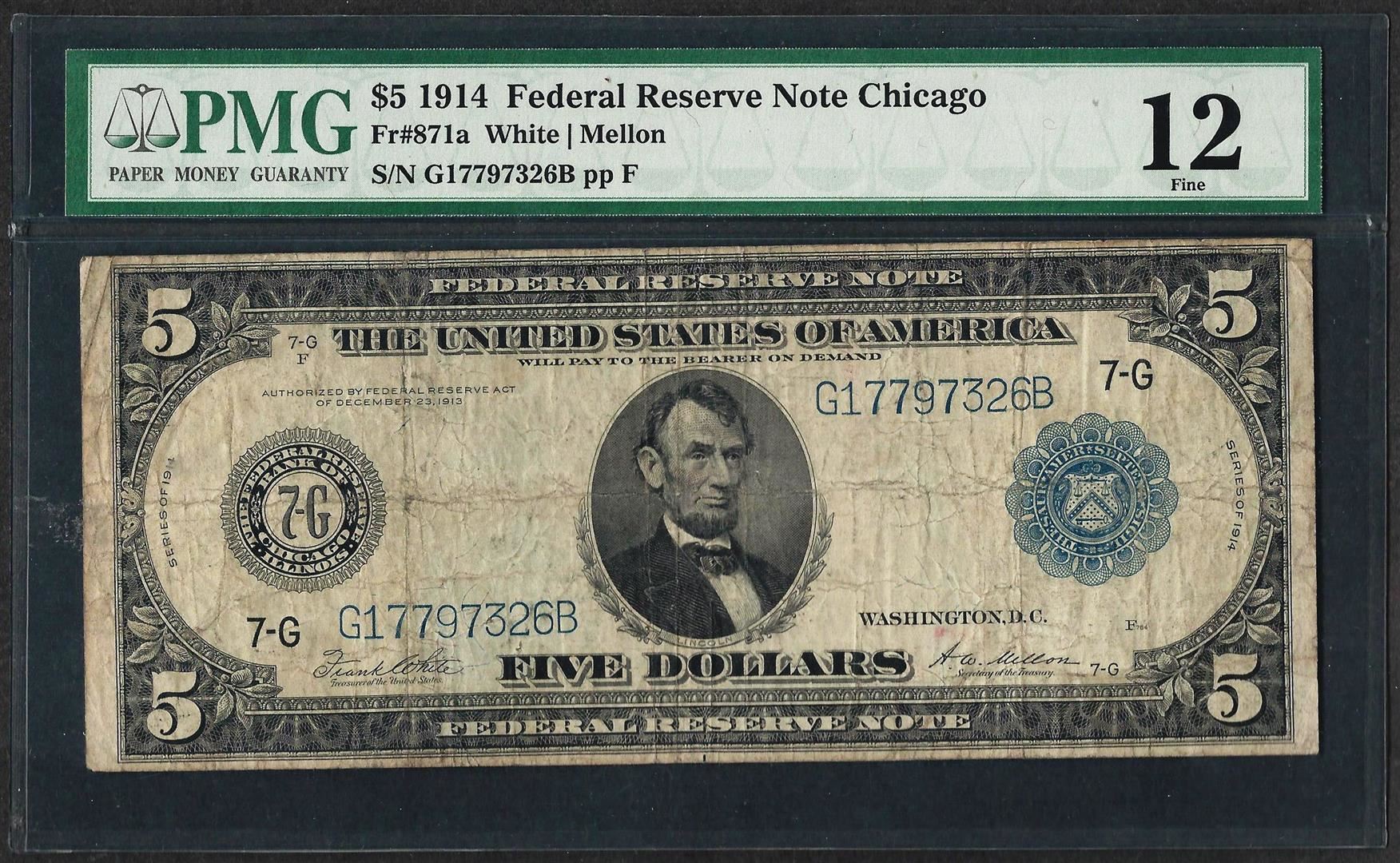 One 1914 $5 Federal Reserve Note Chicago Fr.871a PMG Fine 12. PMG Certified.