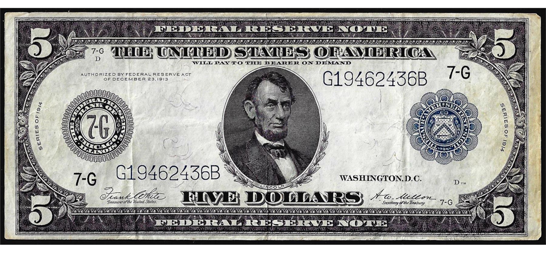 One 1914 $5 Federal Reserve Note Chicago.