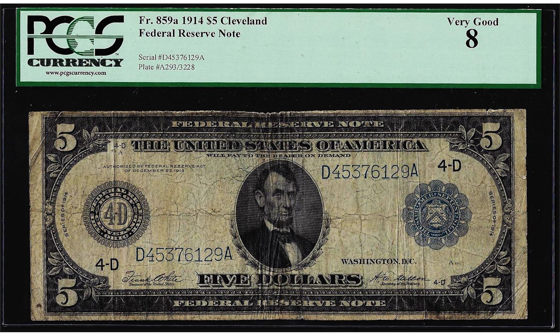 1914 $5 Federal Reserve Note Cleveland Fr.859a PCGS Very Good 8
