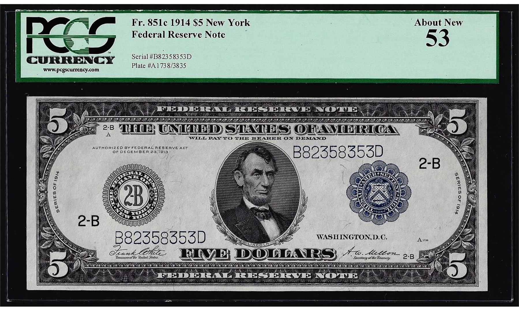 One 1914 $5 Federal Reserve Note Fr.851c PCGS About New 53. PCGS Graded.