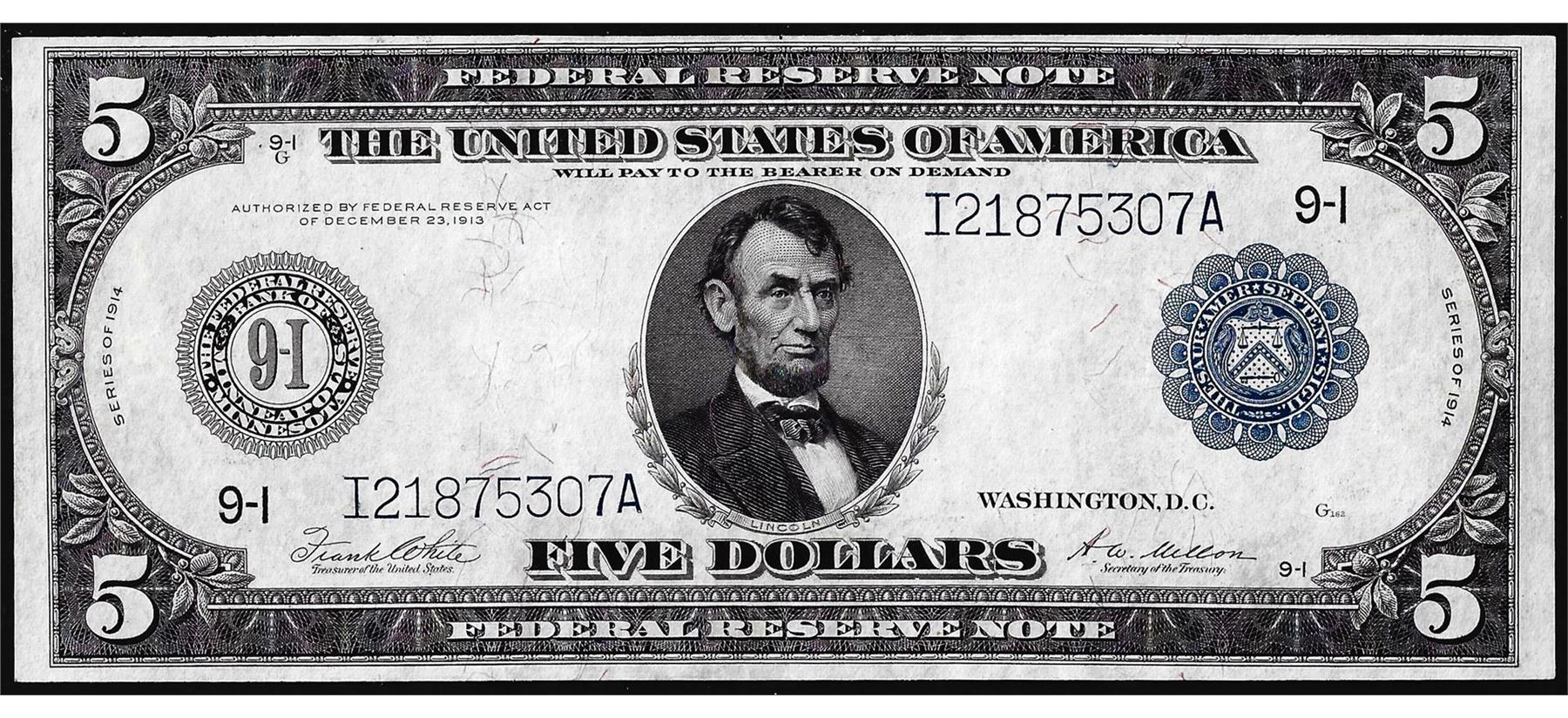 One 1914 $5 Federal Reserve Note Minneapolis.