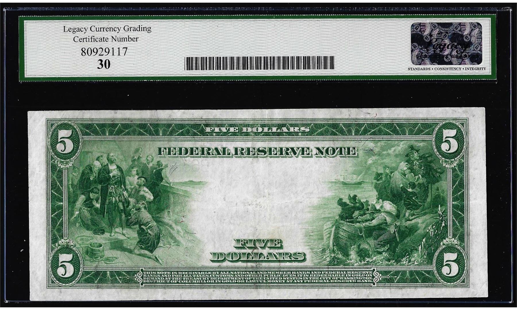 One 1914 $5 Federal Reserve Note New York Fr.851B Legacy Very Fine 30. Legacy Graded.