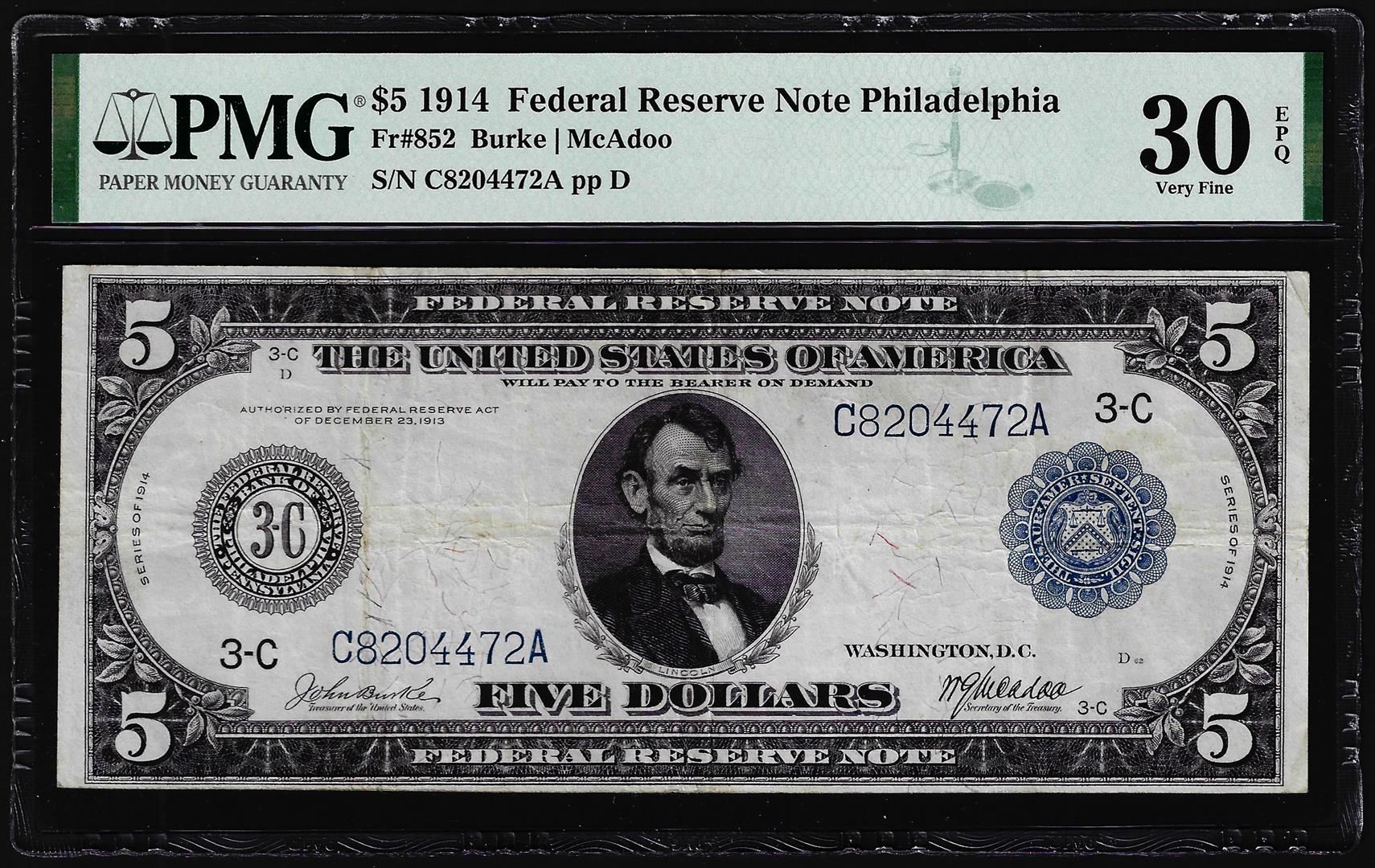 One 1914 $5 Federal Reserve Note Philadelphia Fr.852 PMG Very Fine 30EPQ. PMG Certified.