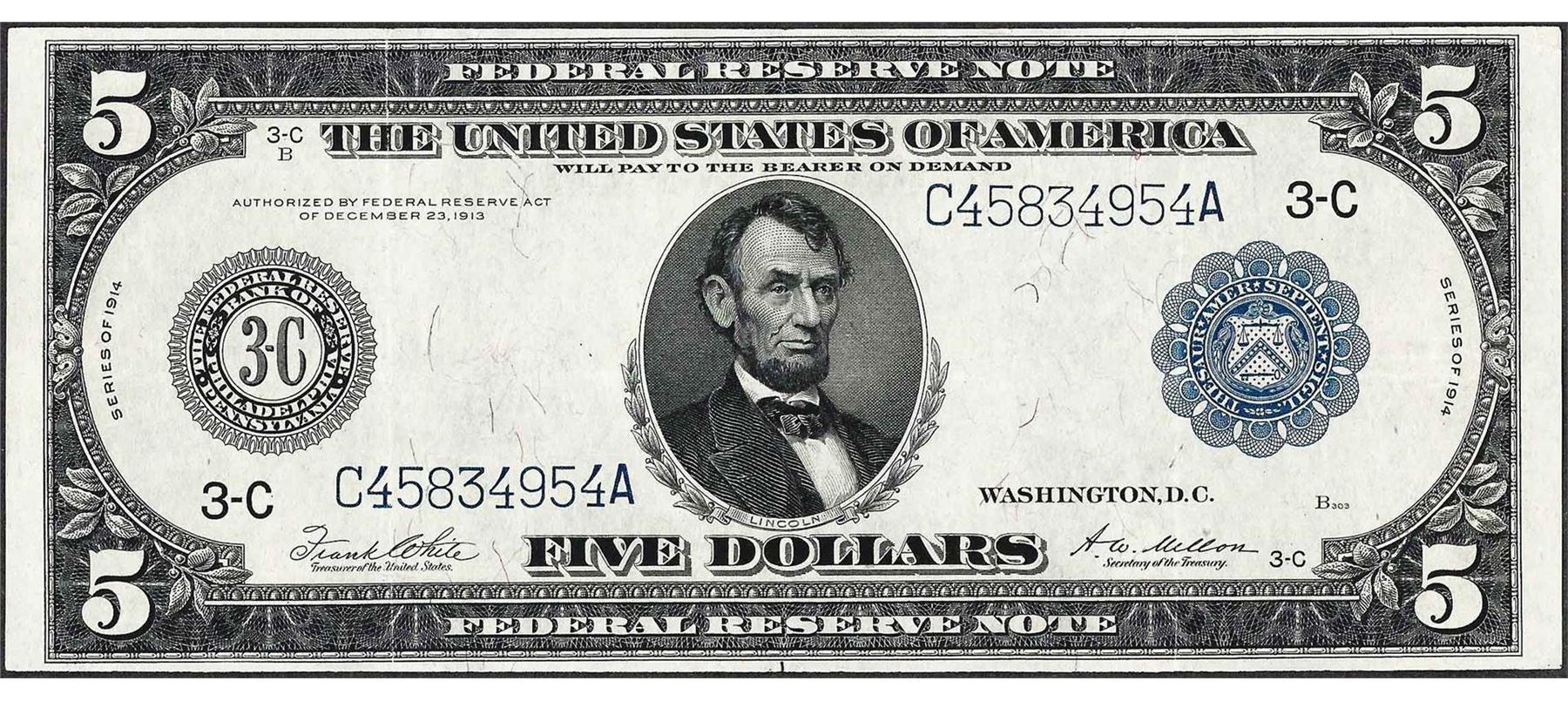 One 1914 $5 Federal Reserve Note Philadelphia.