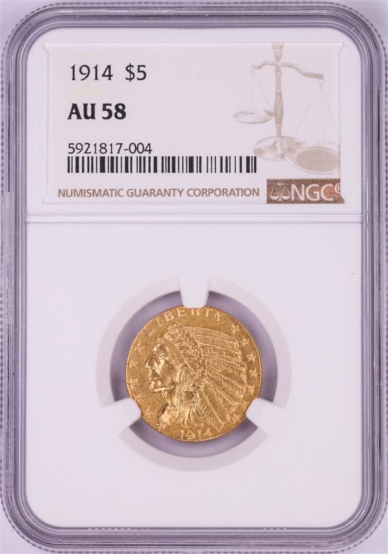 One 1914 $5 Indian Head Half Eagle Gold Coin NGC AU58. NGC Certified.