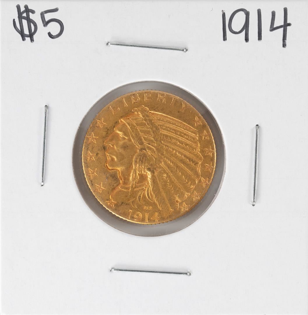 One 1914 $5 Indian Head Half Eagle Gold Coin.