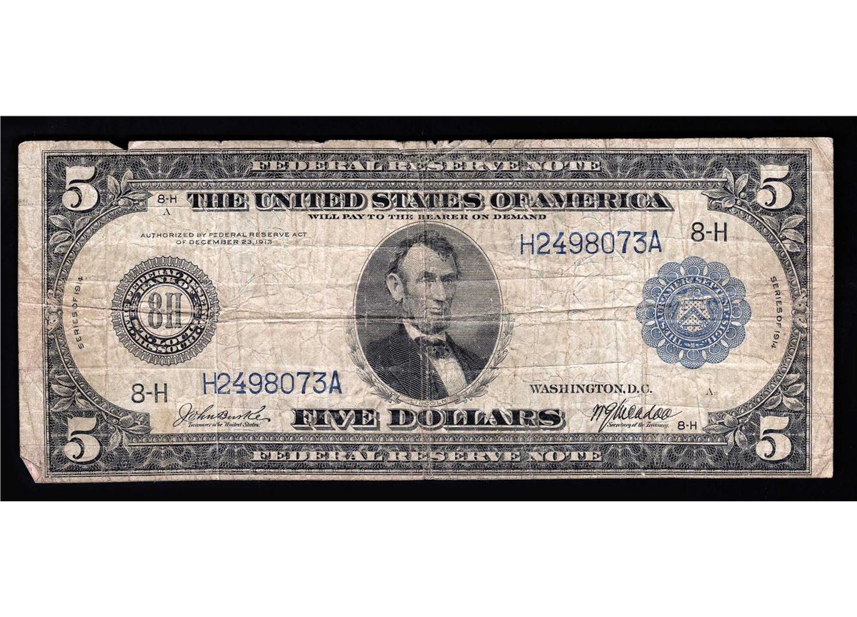 One 1914 $5 Large Size Federal Reserve Note.