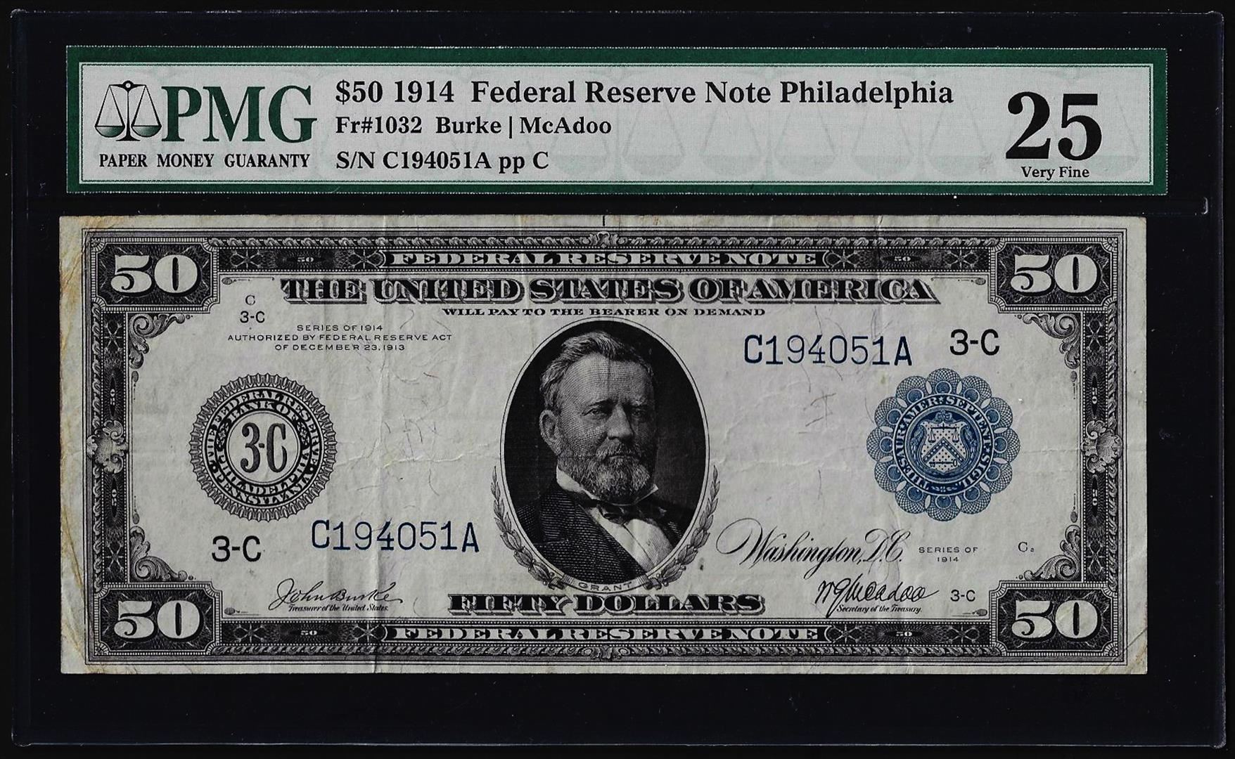 One 1914 $50 Federal Reserve Note Philadelphia Fr.1032 PMG Very Fine 25. PMG Certified.