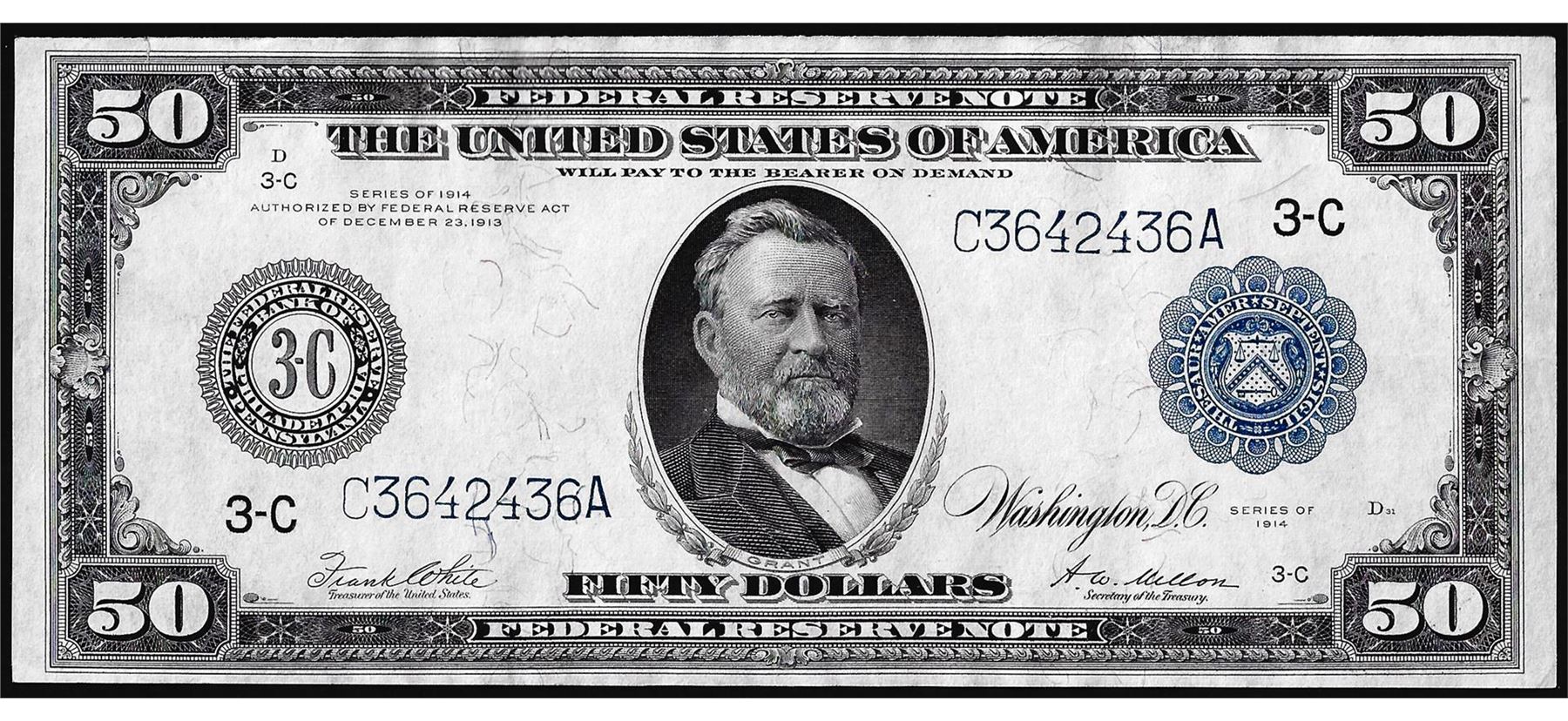 One 1914 $50 Federal Reserve Note Philadelphia.