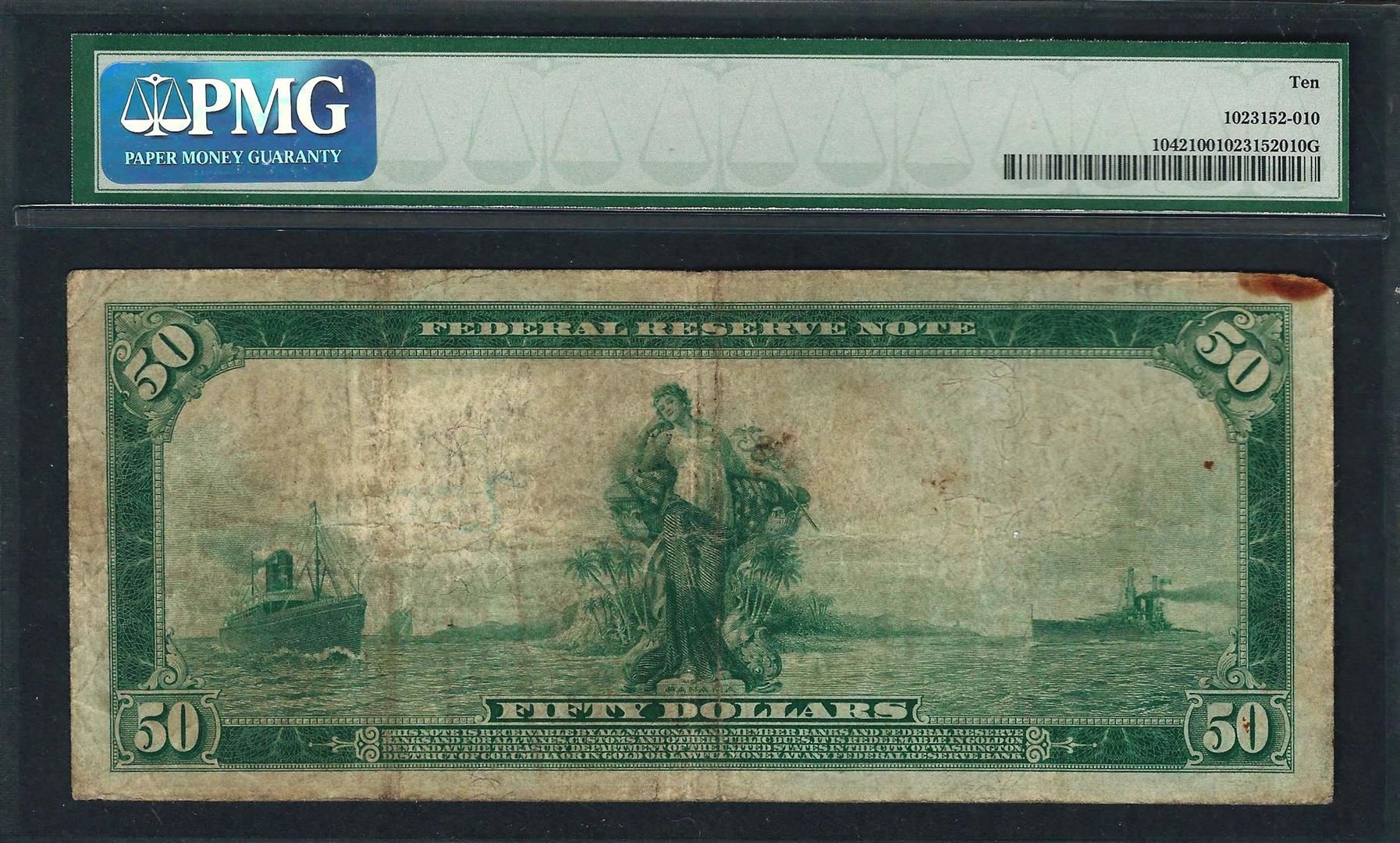 One 1914 $50 Federal Reserve Note Richmond Fr.1042 PMG Very Good 10. PMG Certified.