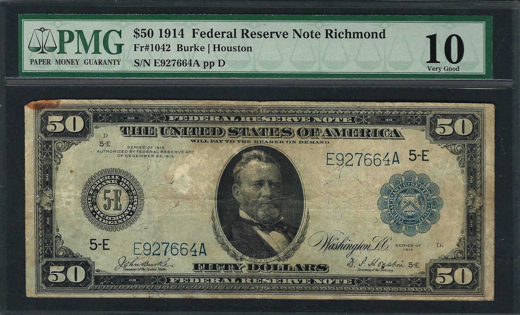 1914 $50 Federal Reserve Note Richmond Fr.1042 PMG Very Good 10