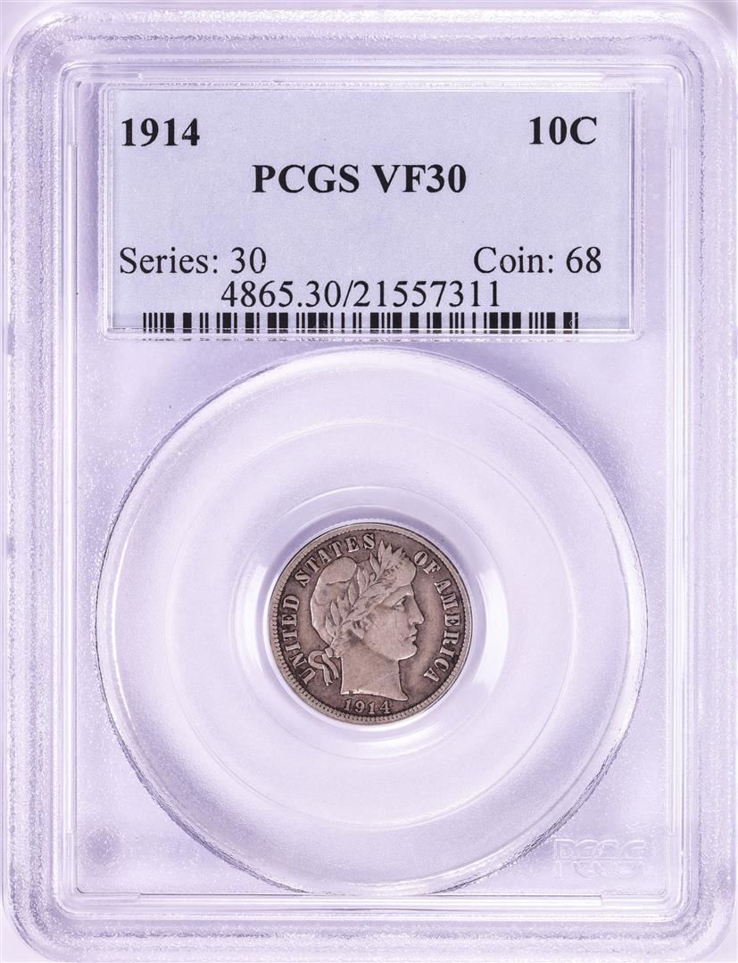 One 1914 Barber Dime Coin PCGS VF30. PCGS Graded.
