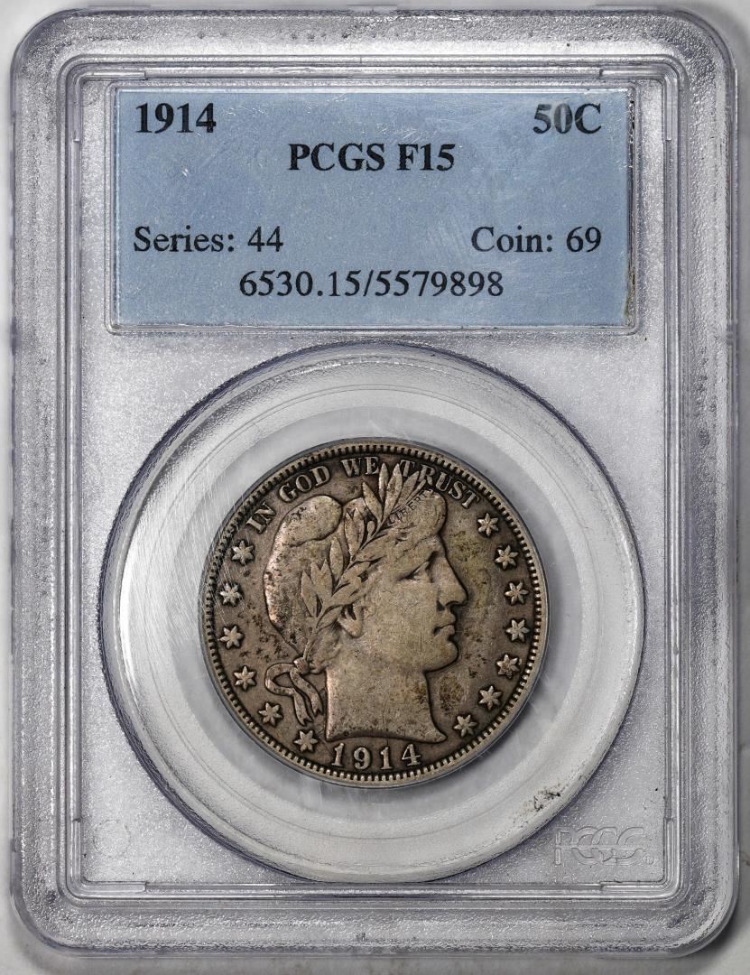One 1914 Barber Half Dollar Coin PCGS F15. PCGS Graded.