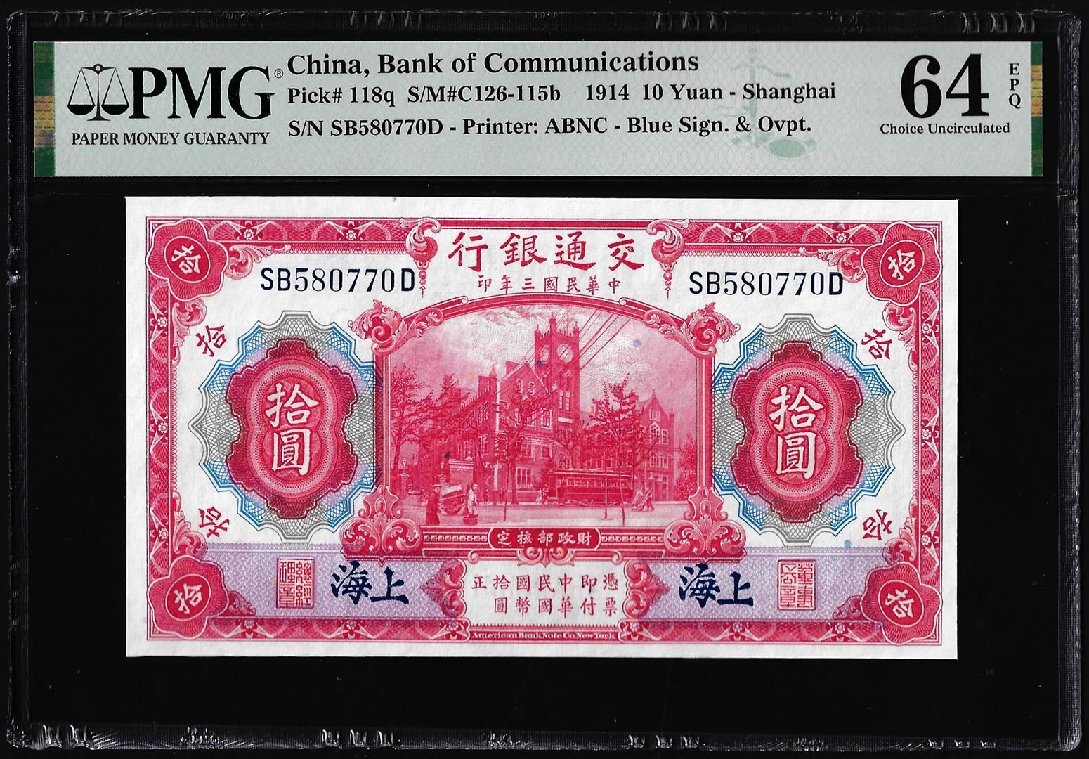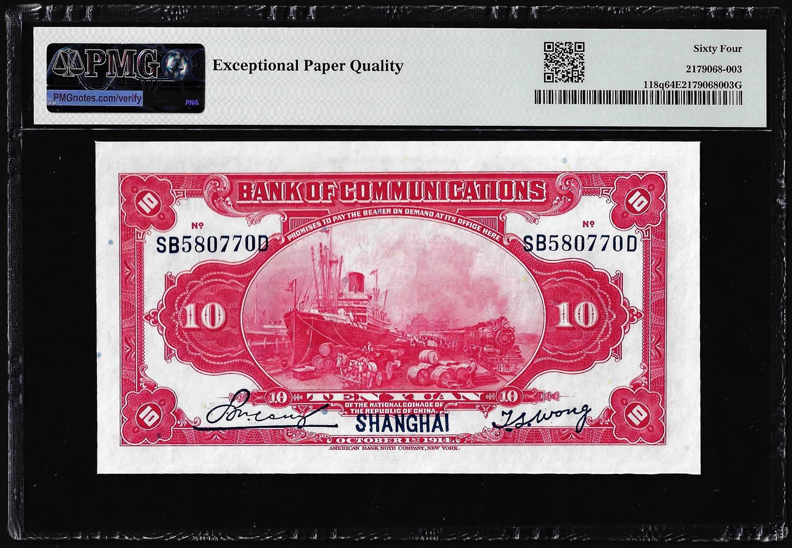 One 1914 China Bank of Communications 10 Yuan Note Pick# 118q PMG Ch. Uncirculated 64EPQ. PMG Certified.