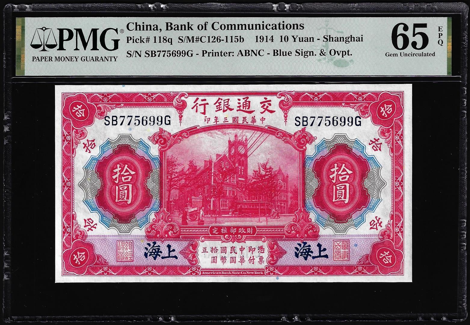 1914 China Bank of Communications 10 Yuan Note Pick# 118q PMG Gem Uncirculated 65EPQ