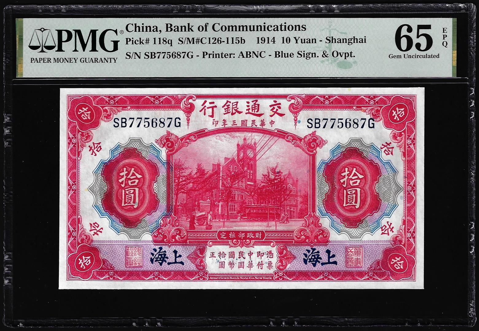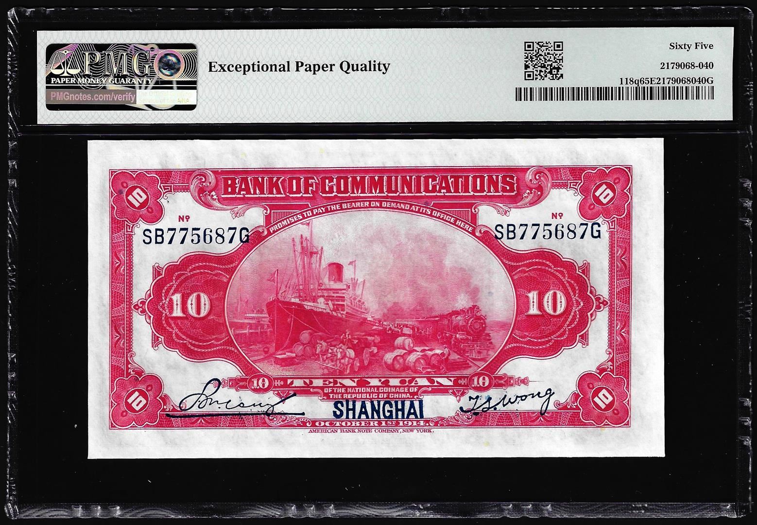 1914 China Bank of Communications 10 Yuan Note Pick# 118q PMG Gem Uncirculated 65EPQ