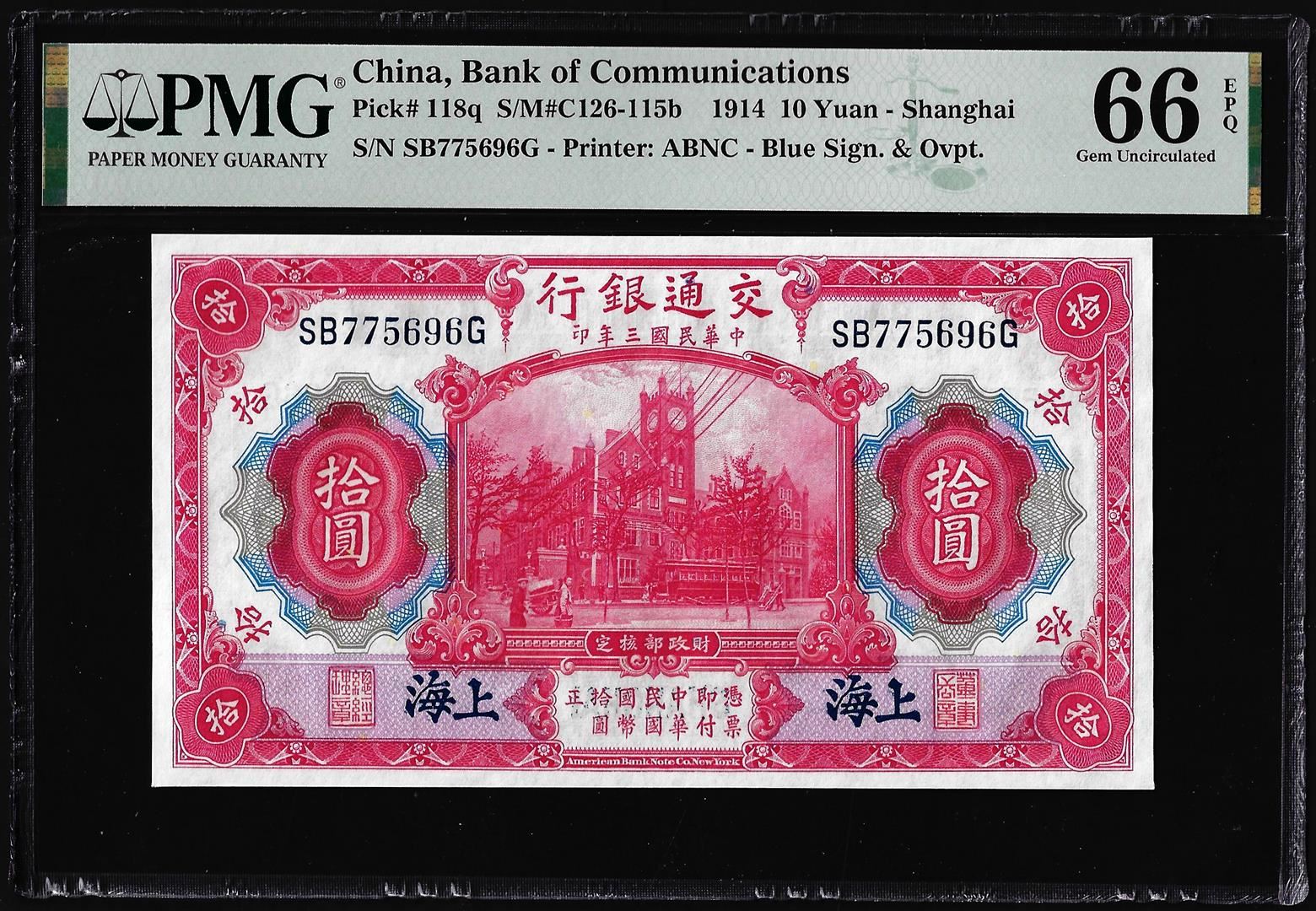 1914 China Bank of Communications 10 Yuan Note Pick# 118q PMG Gem Uncirculated 66EPQ