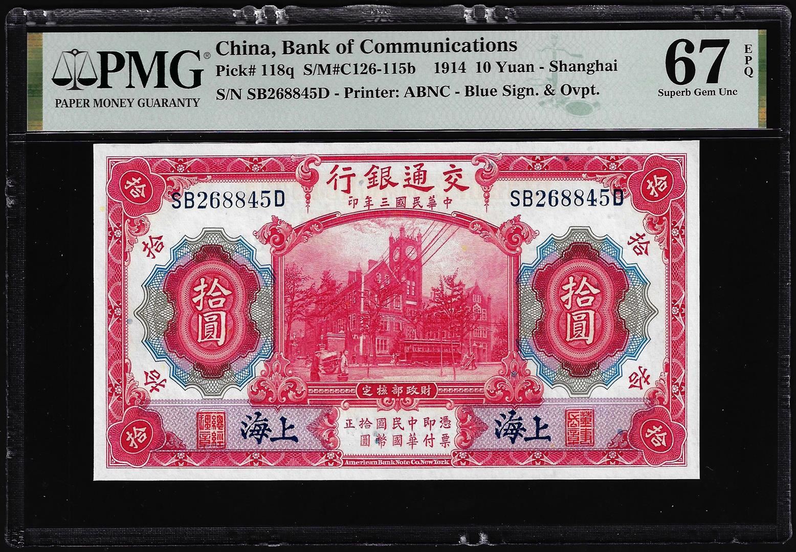 1914 China Bank of Communications 10 Yuan Note Pick# 118q PMG Superb Gem Unc. 67EPQ