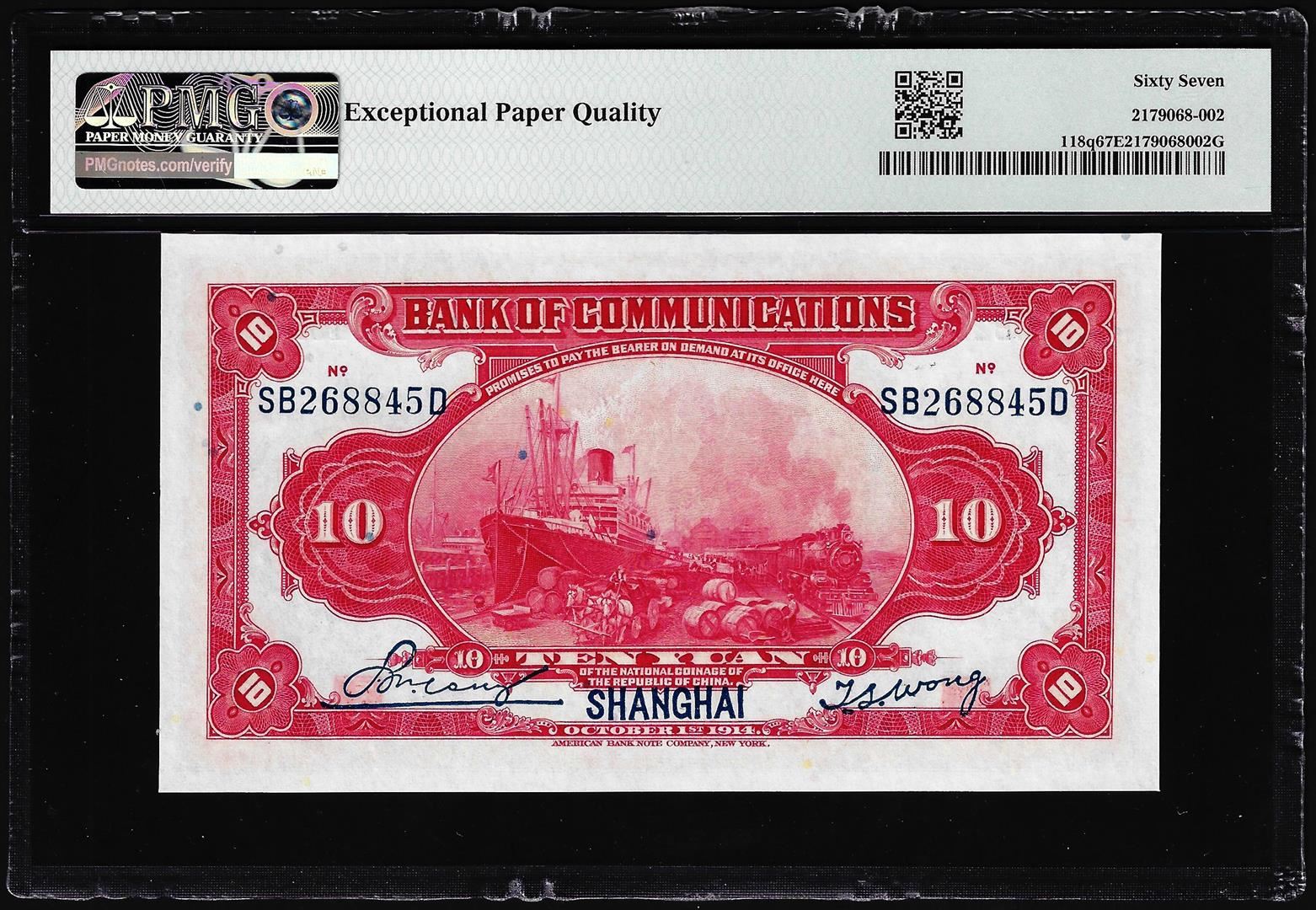 One 1914 China Bank of Communications 10 Yuan Note Pick# 118q PMG Superb Gem Unc. 67EPQ. PMG Certified.