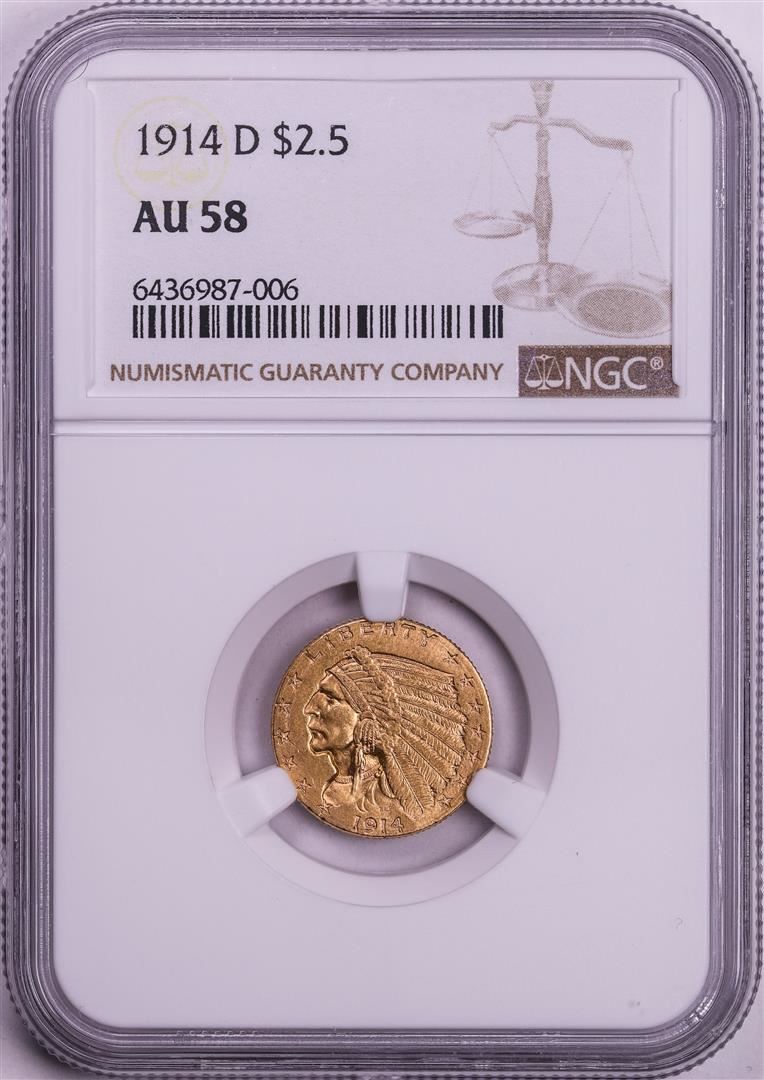 1914-D $2 1/2 Indian Head Quarter Eagle Gold Coin NGC AU58